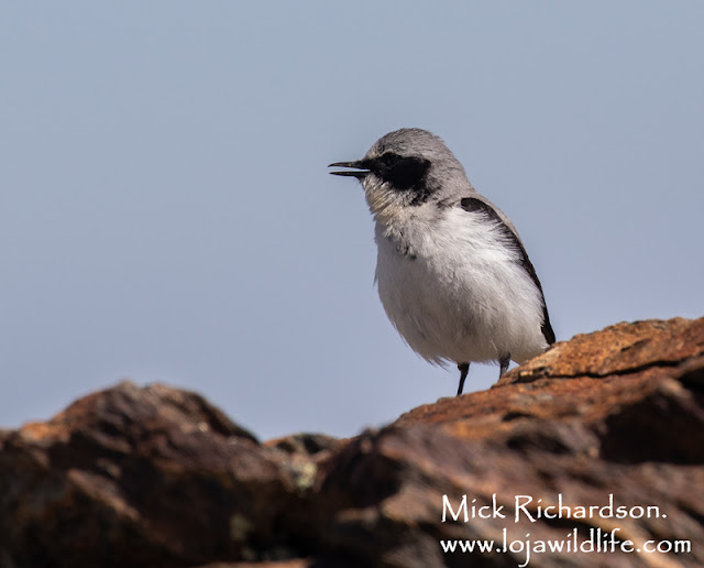 Northern Wheatears (Collalba Gris / Oenanthe oenanthe) including a slightly oddly plumage bird, Eurasian Skylark (Alondra Común / Alauda arvensis), Western House Martin (Avión Común Occidental / Delichon urbicum),